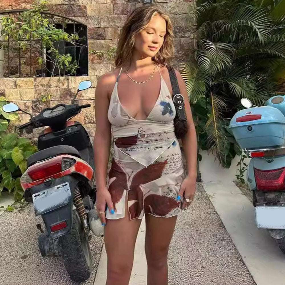 2Pcs Printed Suit Summer Sexy V-neck Halter Top And Pleated Short Skirt Women's Dress Set Clothing