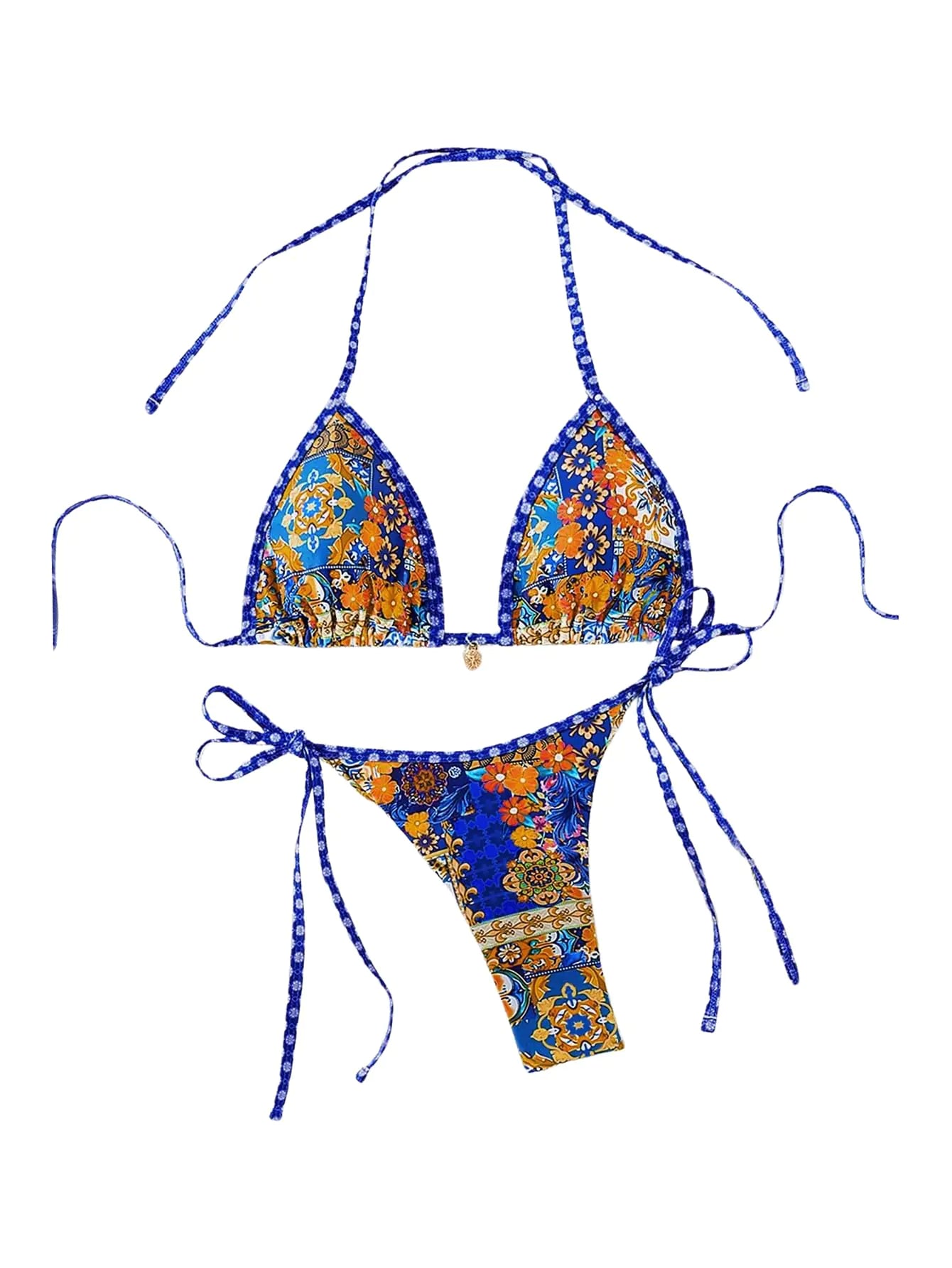 BEAUDRM Womens 2 Piece Floral Bikini Boho Halter Triangle Bikini Set Tie Back Swimsuit Bathing Suit Beachwear Swimwear Royal Blue Large