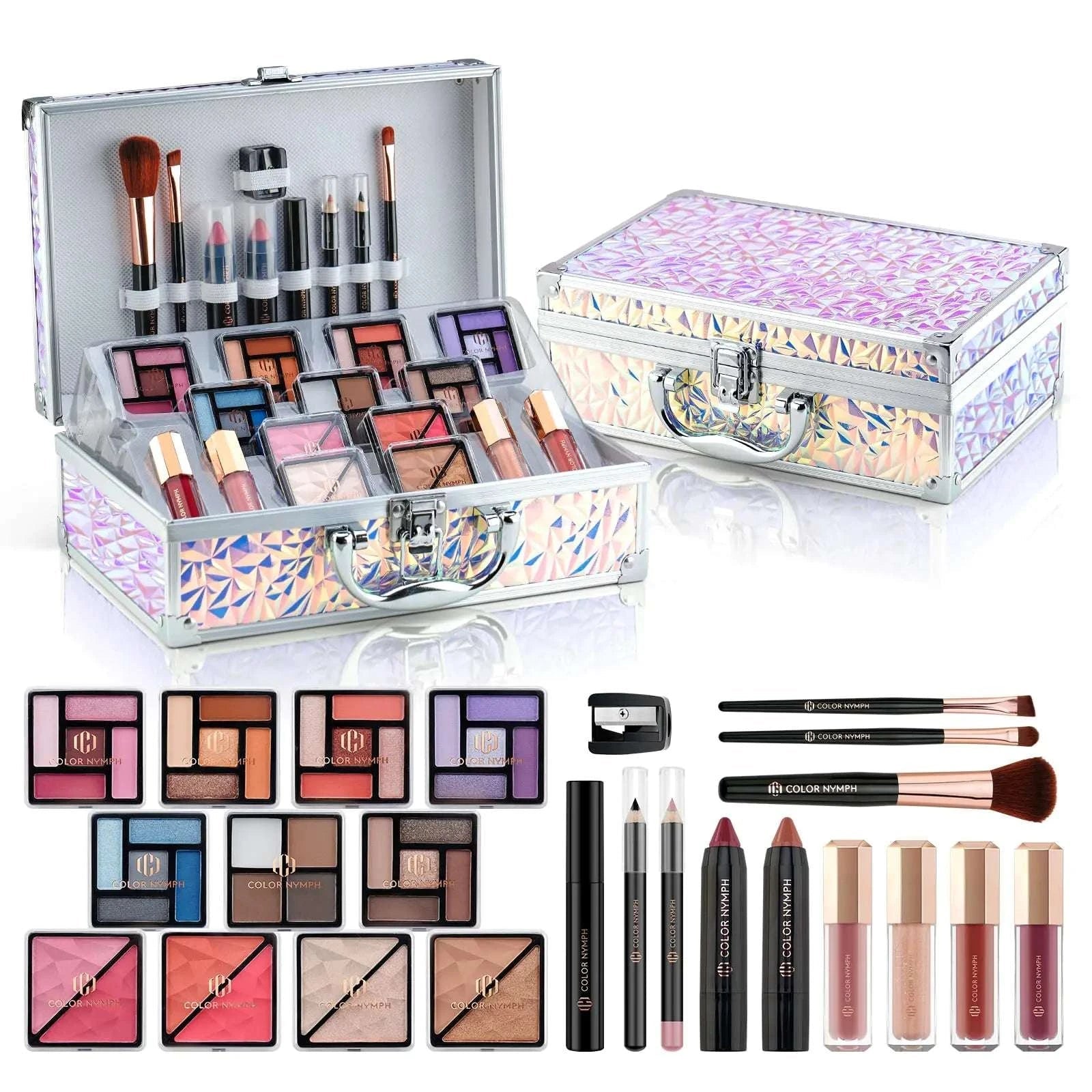 Color Nymph Makeup Kit with Cosmetics Case Train Case Makeup Kits For Teenage Girls Beginner Women Make up Kit Cosmetics Box Includs Eyeshadow Lipstick Blush Lipgloss Mascara and Tools -Dreamy Silver