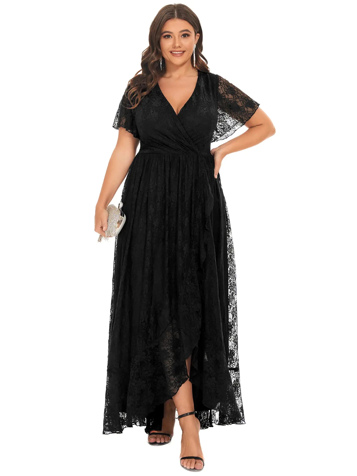 Ever-Pretty Plus Womens V Neck Ruffles Sleeves Lace Summer Plus Size Semi Formal Dress for Curvy Women Black US26