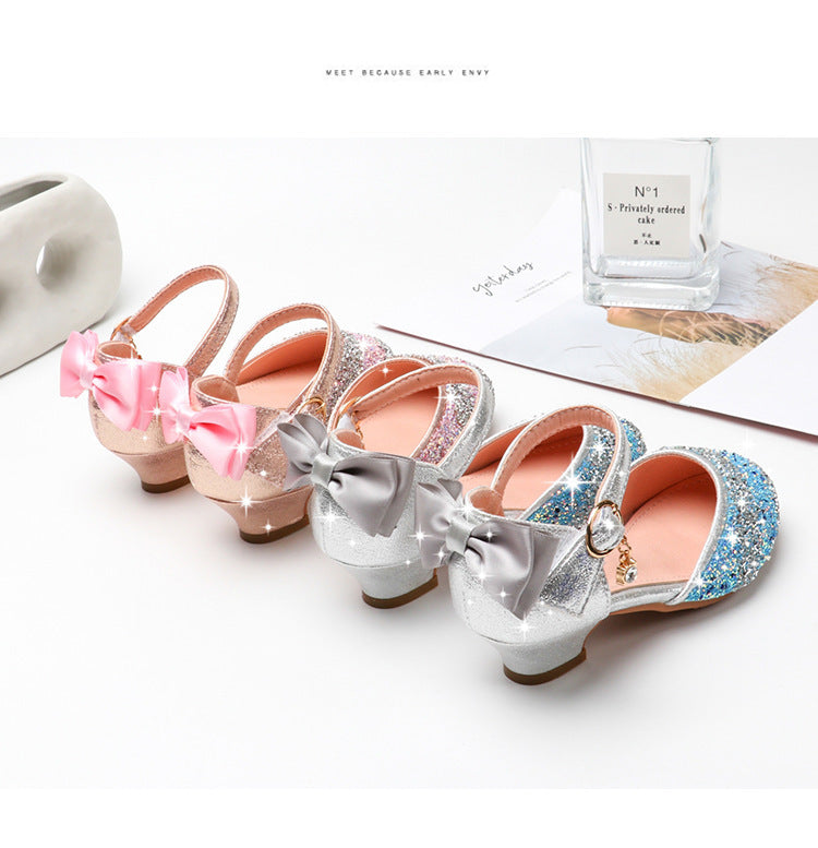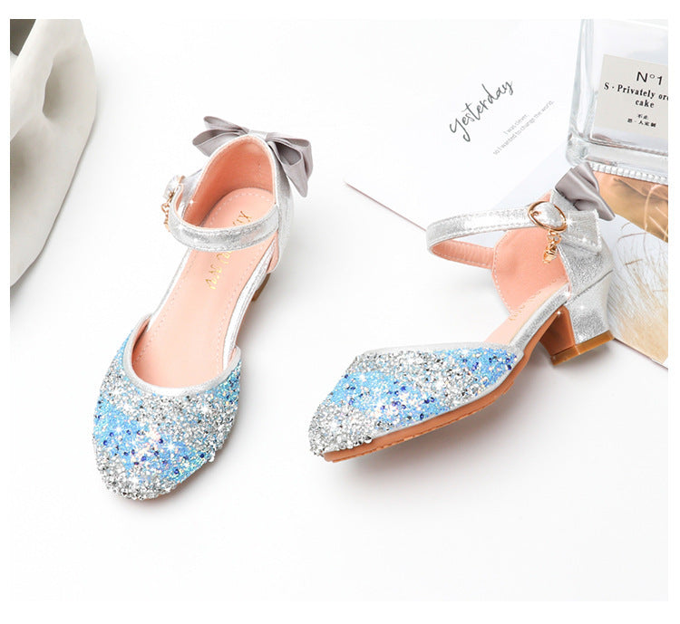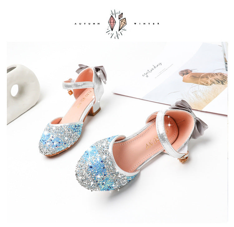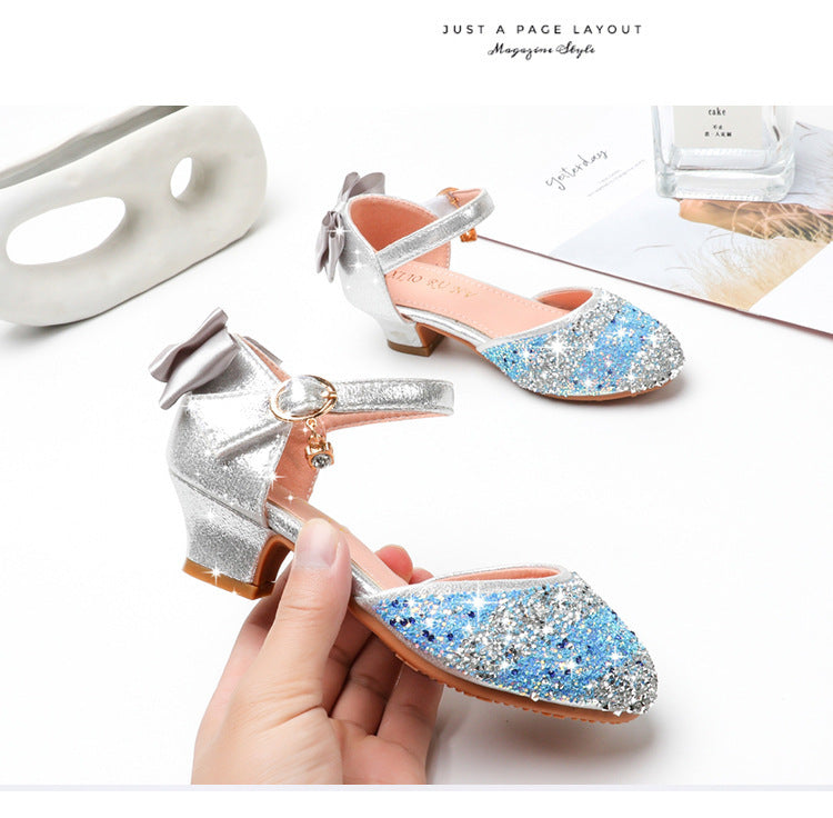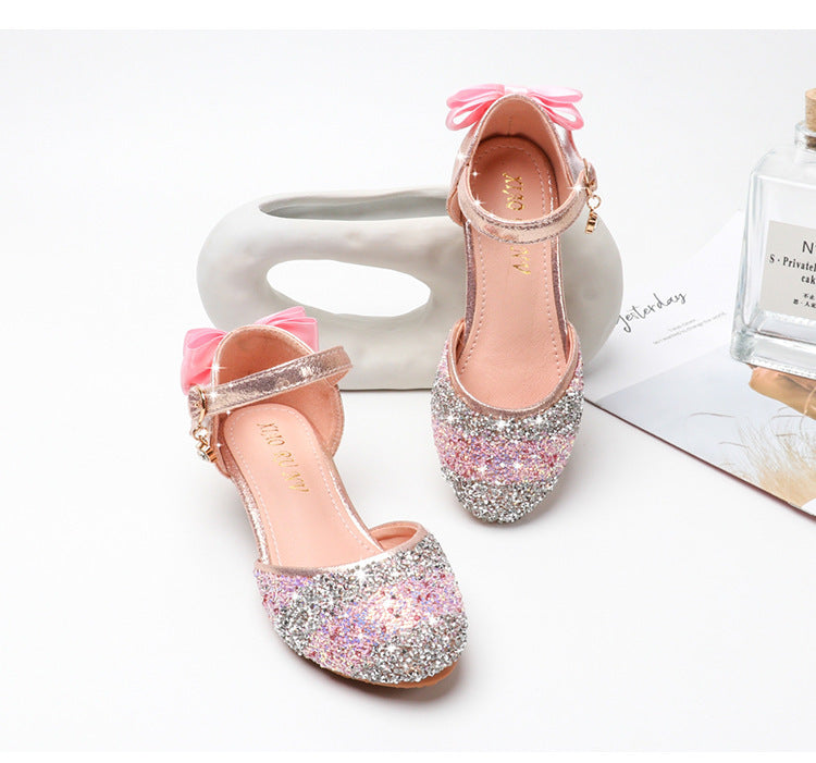 Girls' High Heel Summer Rhinestone Hollow Children's Sandals Sequin Striped Primary School Student Pumps Female