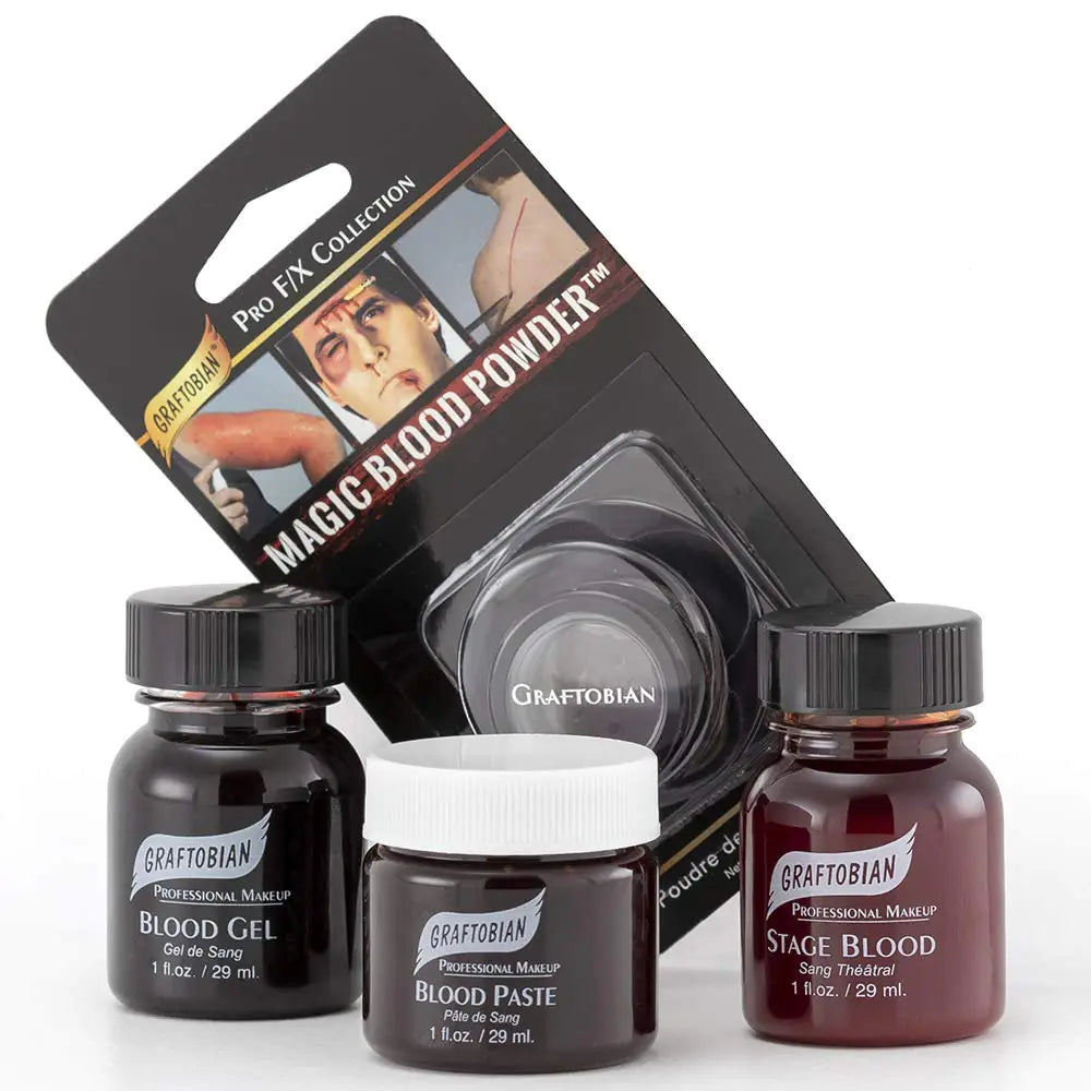 Graftobian Blood Sampler Set Makeup Kit - with 4 FX Bloods - Blood Gel Blood Paste Stage Blood Magic Blood Powder