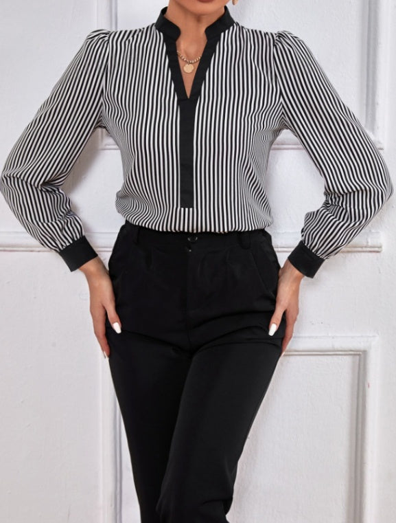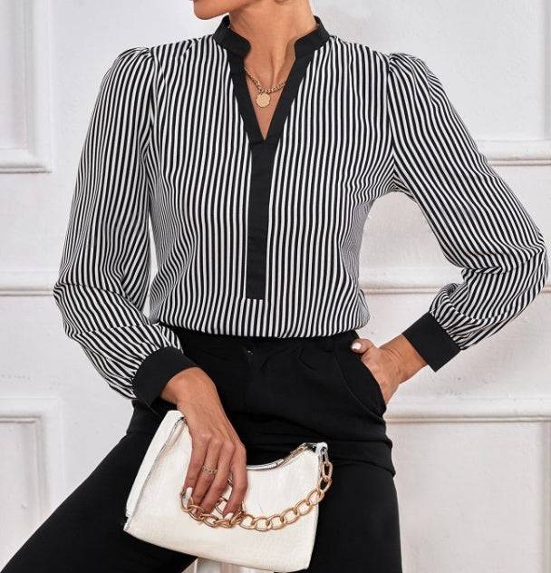 Ladies' New Striped V-neck Cuff Collar Color Block Splicing Fashion Shirt