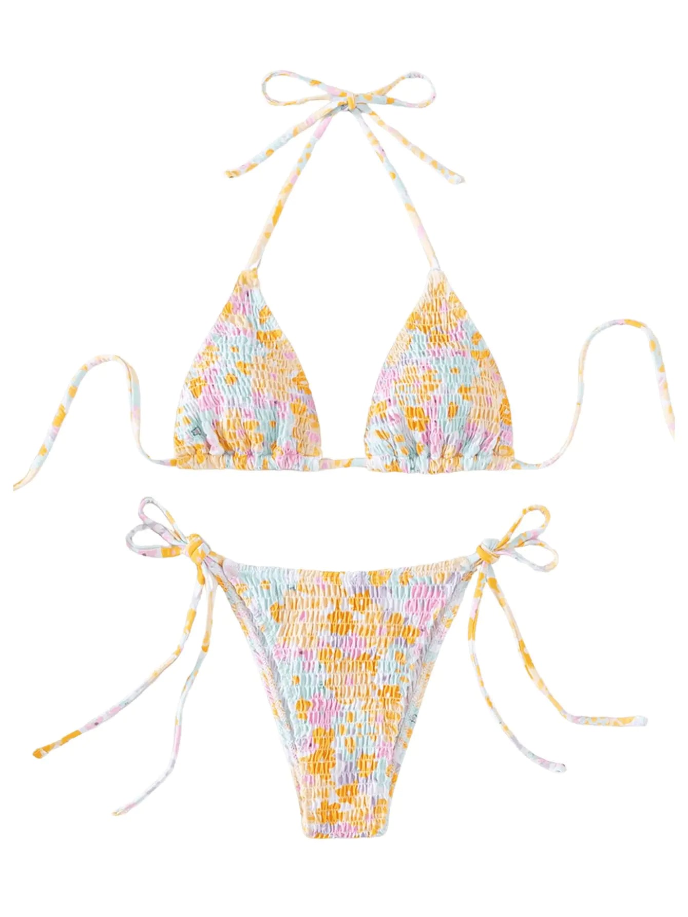 RoseSeek Womens 2 Piece Floral Bikini Sets Smocked Halter Triangle Bikini Drawstring Tie Side Sexy Cute Swimsuits Bathing Suit Orange X-Small