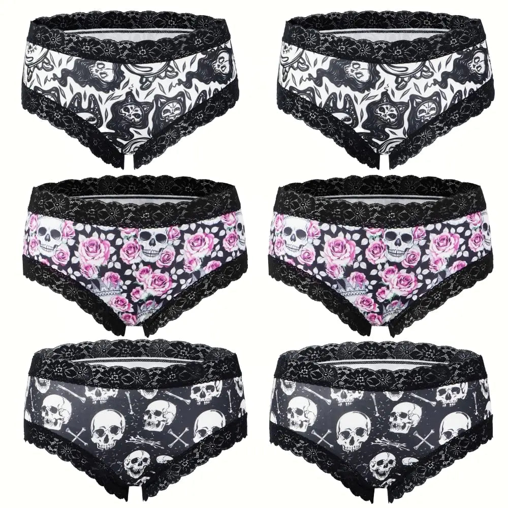 SENBEVINI 6pcs Gothic Chic Low-Rise Bikinis - Contrast Lace Skull & Eyeballs & Stars Print Comfortable Hipster Panties for Women (US Alpha Large Regular Regular Multicolor)