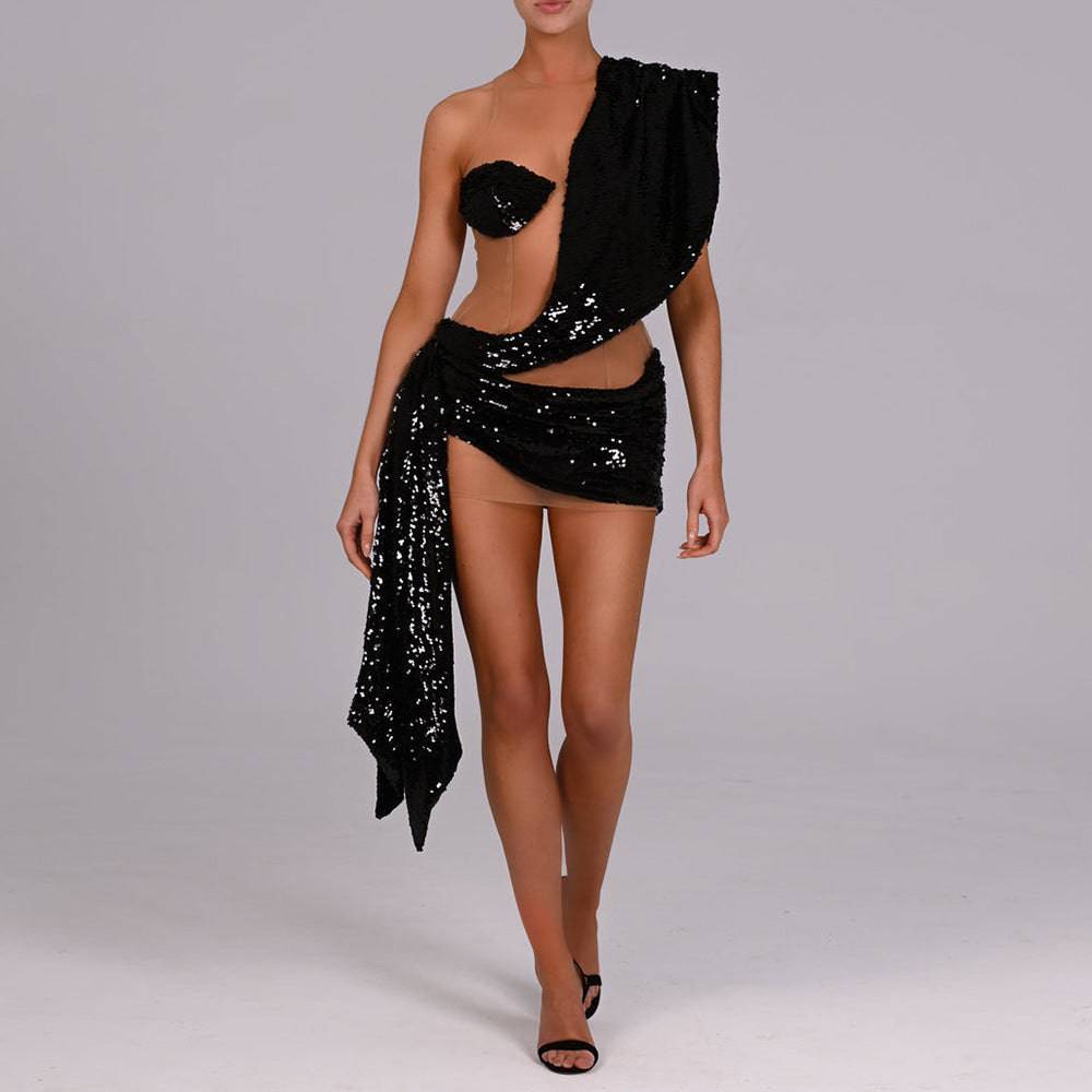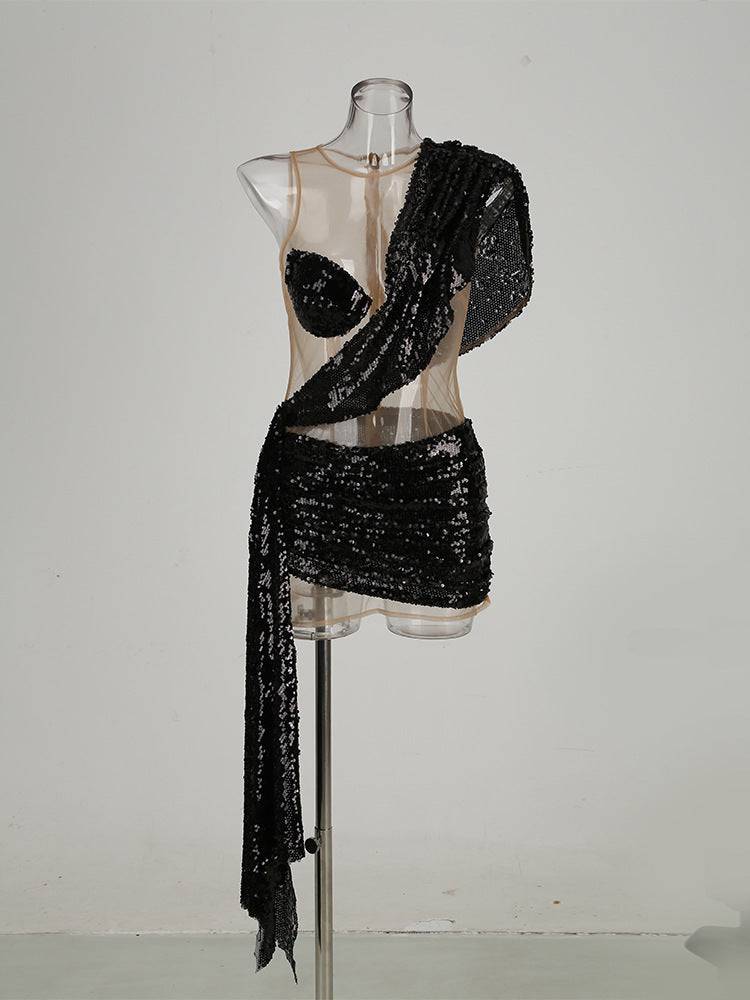 Sexy See-through Sequins Elegant Shoulder Stitching Dress