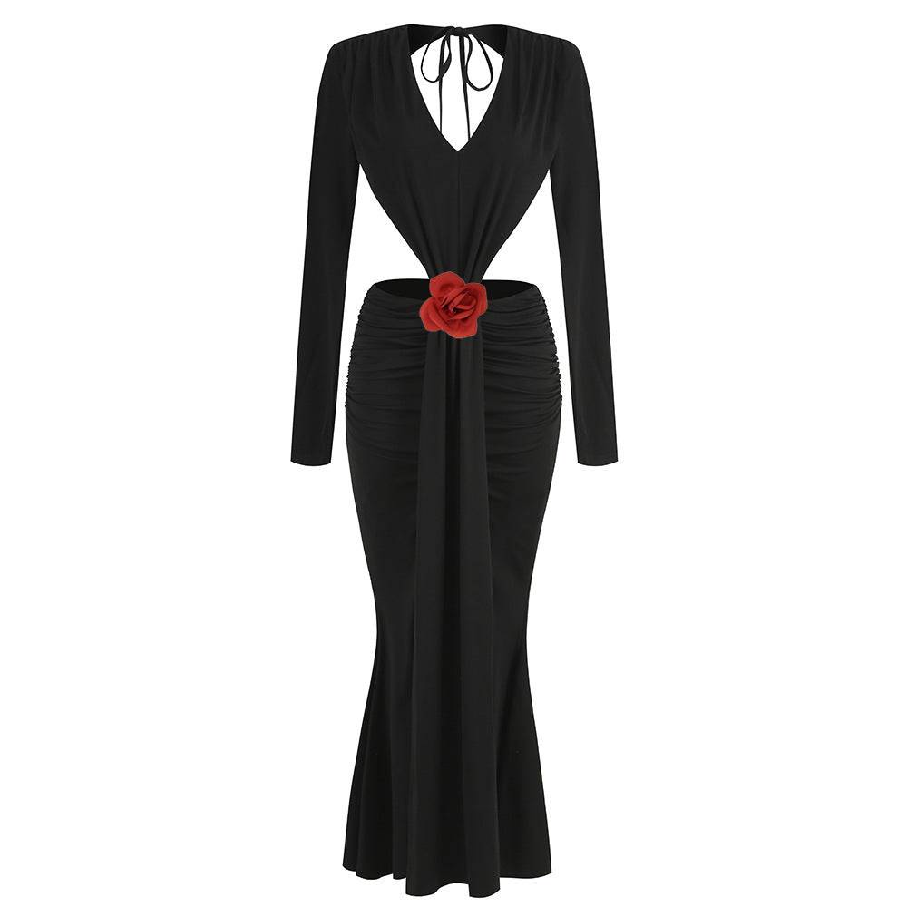 Sexy V-neck Backless Long Sleeves Skirt Waist Decorative Flower Split Fishtail Gown Dress Long