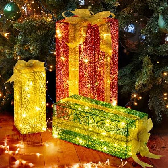 VINGLI Lighted Gift Boxes Set Of 3, Pre-lit Nestable Present Boxes Ornament With 90 LED Warm White Lights And Stakes For Christmas Outdoor Indoor Decorations Lighted Holiday Displays