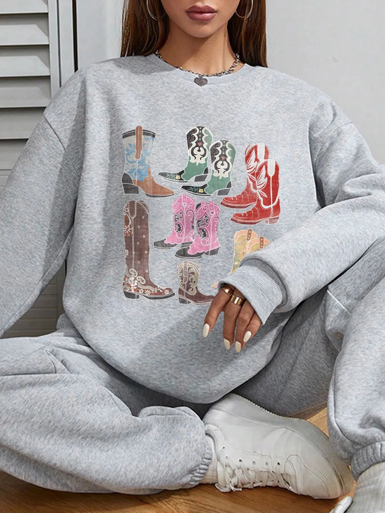 Women Basic Casual Pullover Spring Autumn Long Sleeve Boots Illustrated Printed Round Neck