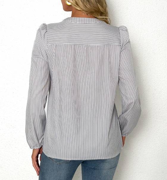 Women's Solid Color V-neck Striped Fashionable Versatile Shirt Top