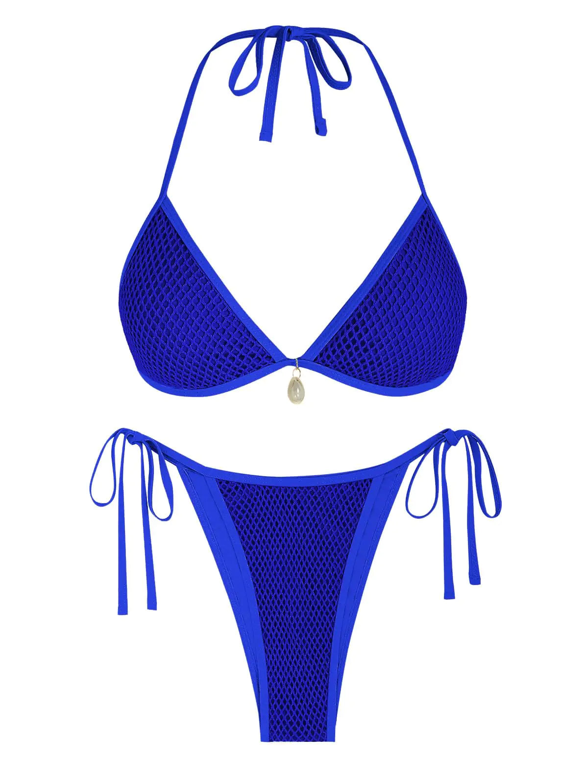 ZAFUL Halter Bikini for Women Sexy Bikini Sets Side Tie High Cut Swimsuis Trendy 2 Piece Bathing Suit Fishnet Overlay Royal Blue L