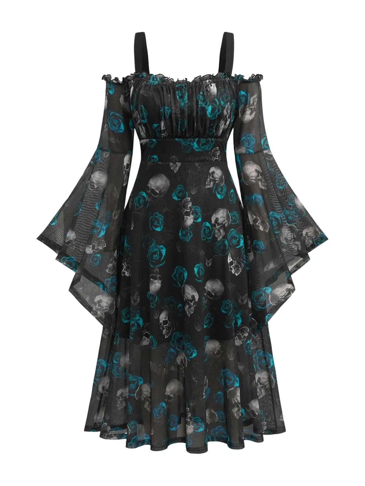 Rosegal Plus Size Women Medieval Renaissance Costumes Dress Gothic Bell Sleeves Cold Shoulder Skulls Rose Mesh Dress Halloween Costumes Dress Witch Cosplay(Blue_1/5X)